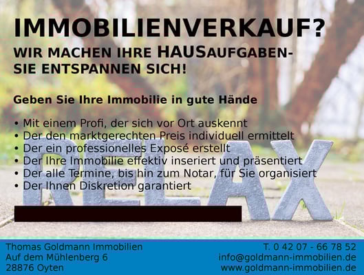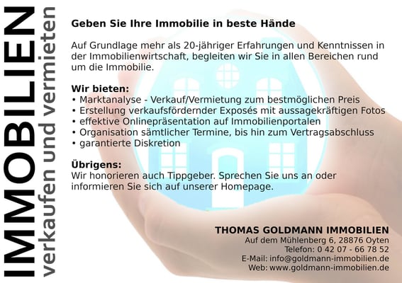 Immobilienmakler im Bereich des Verkaufs und der Vermietung von Häusern, Wohnungen und Grundstücken tätig. Unser Tätigkeitsgebiet umfasst Bremen, den Landkreis Verden, den Landkreis Osterholz,